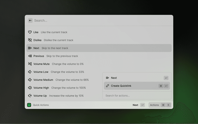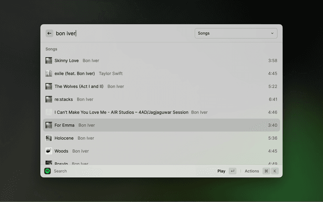 See what's currently playing. Use the actions (⌘ K) for further actions, such as Play/Pause, Like/Dislike, Skip, Start Radio, Add to Playlist, Connect Device and more.